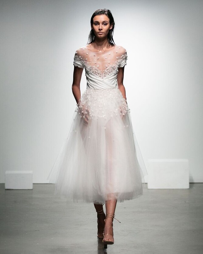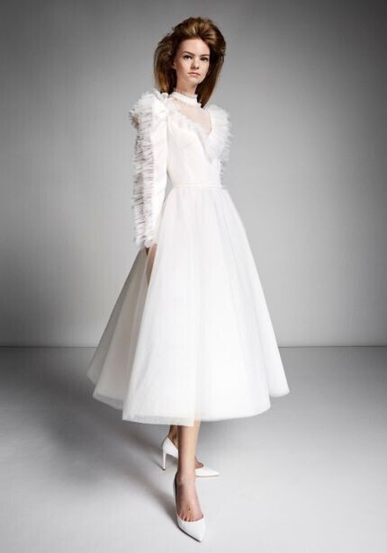 3. This tulle wedding dress has a modern yet traditional feel. Loving all the delicate detail on the tulle. Those pockets built into the skirt are just gorgeous. We love the transparency of this dress which makes it unique and special. The midi length also allows you to wear some lovely statement heels to complete the look. Great for an outdoor intimate wedding or registry wedding.