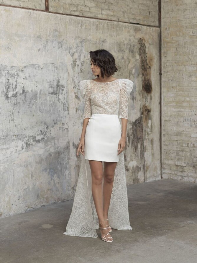 6. Our final look is great for a non traditional bride. Who still wants to add drama to their wedding dress. The brilliant statement sleeves along with the train adds the unique look to this dress. Its short length skirt cut as a pencil skirt teamed together with the embroidered tulle is amazing. Perfect for a fashion forward bride that wants something different on their wedding day!!!