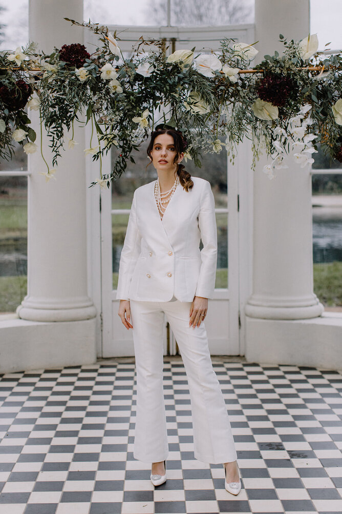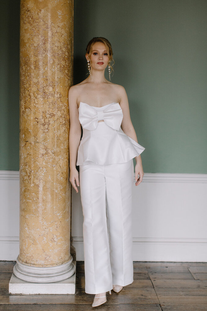 Tip: Opt for soft ivory silks or satins to reflect natural light beautifully in photos. Our strapless Mikado silk top with cut out feature &bow, matched with tailored trousers photograph like a dream in countryside or city settings.
