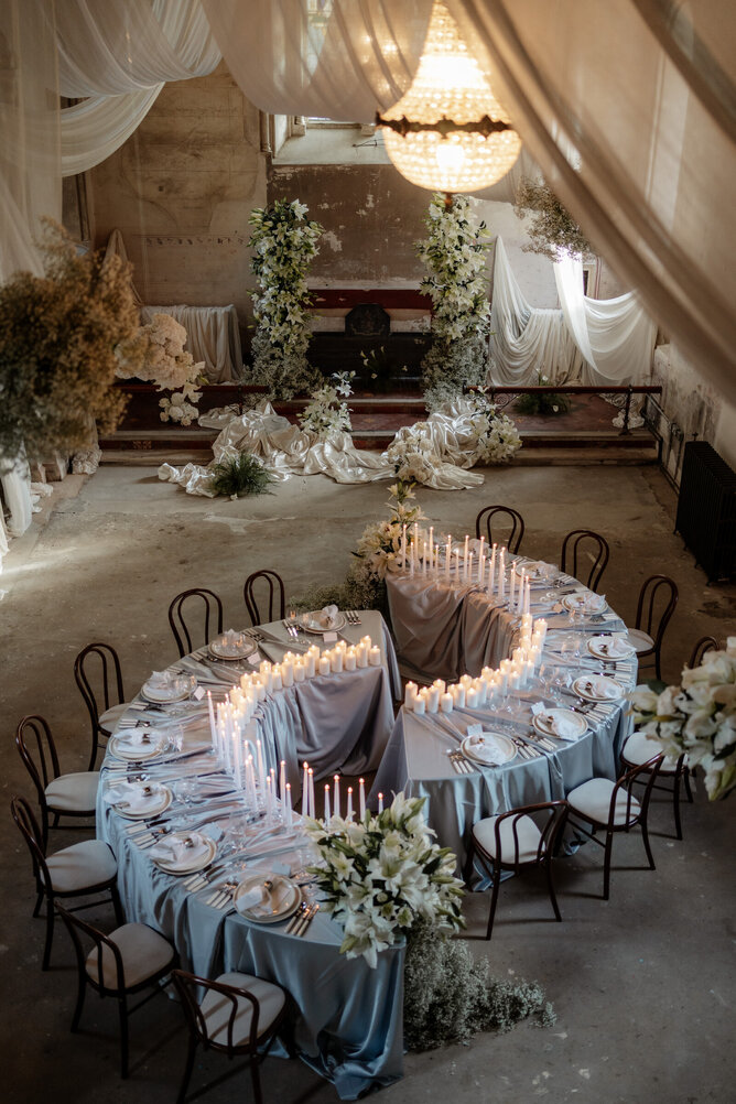 The creative team styled the shoot to highlight contrast and harmony: sleek bridal silhouettes set against the romantic, historic backdrop of the Bell Tower. Flowing fabrics, candlelight, and soft floral installations surrounded the scene, bringing warmth and intimacy to the grandeur of the space.