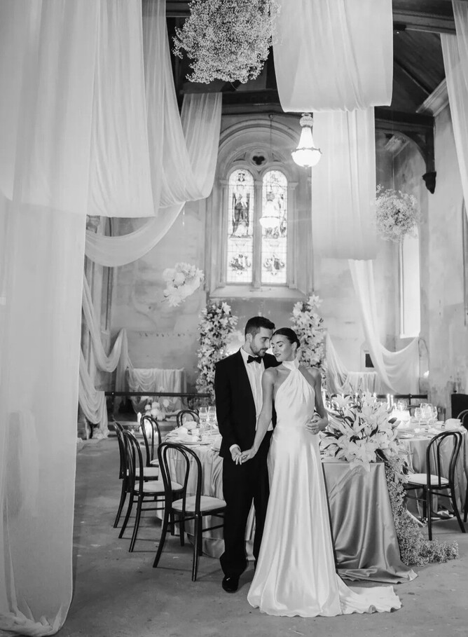 Discover modern bridal elegance with Kate Edmondson Bridal’s latest collaboration with L’Atelier Workshop at The Elvetham Bell Tower in Hampshire. Featuring two bespoke gowns a strapless silk satin Organza design and a bias-cut halter neck dress this styled shoot captures timeless sophistication for the modern bride.