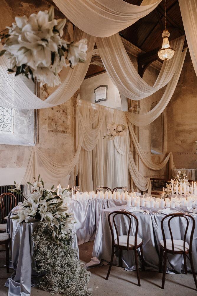 The Bell Tower at The Elvetham provided a setting of understated grandeur soft, neutral stone walls and romantic natural light filtering through historic windows. The styling embraced soft drapery, abundant florals, and a serene palette of ivory, blush, and delicate greens. Every element worked harmoniously to enhance the luxury and grace of the gowns we created.