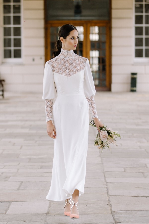 Our third bridal dress is inspired by a formal classic yet contemporary design, popular with starlets from the 20th century. The ankle-length skirt is pure 'City Chic' for weddings set in stunning architectural city venues and for brides who wanted to flaunt their shoes! Faber Novella heels look spectacular below the slim fitting dress with structured sleeves.